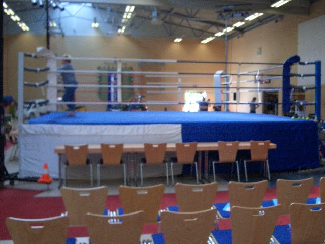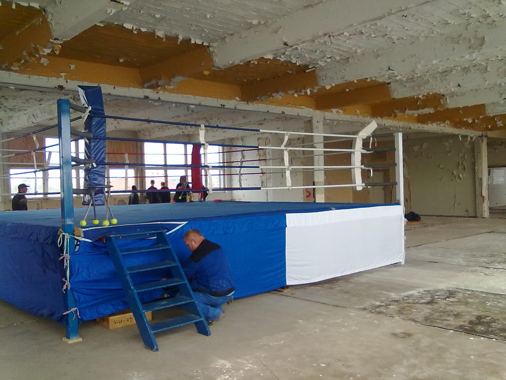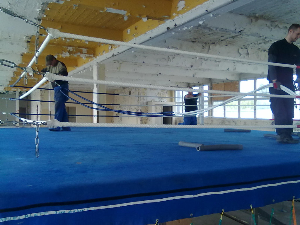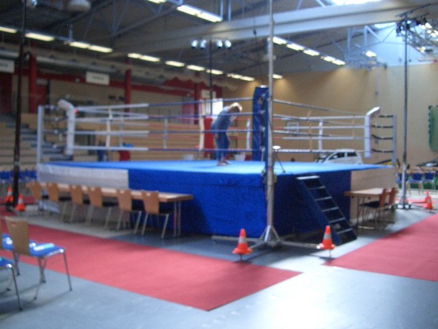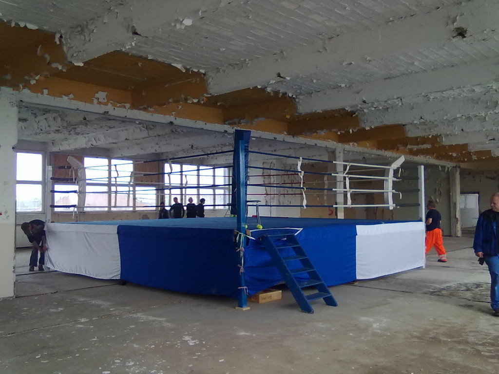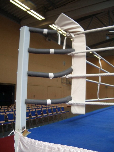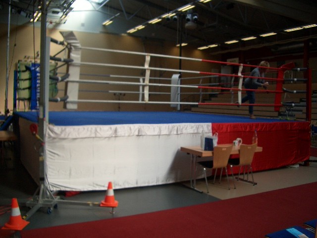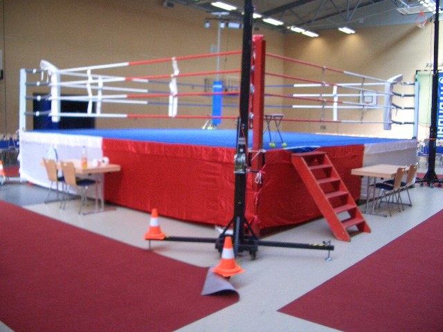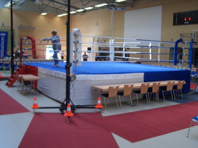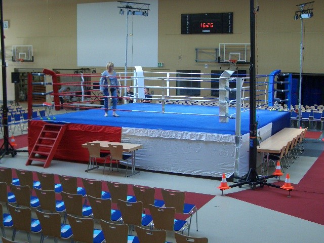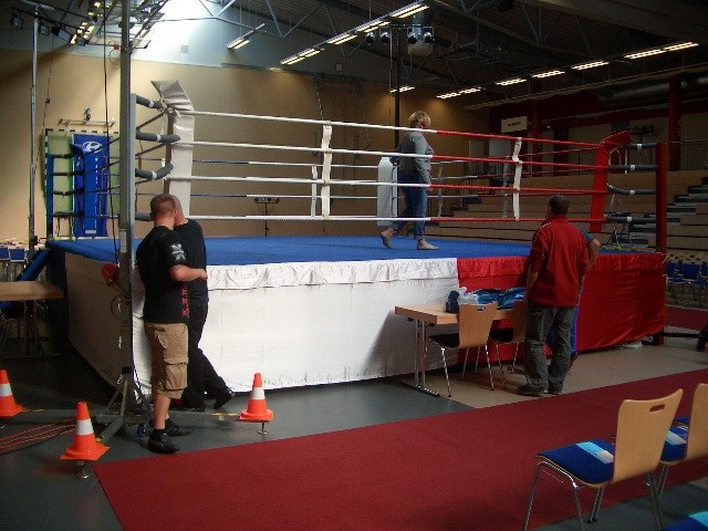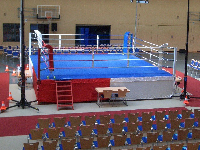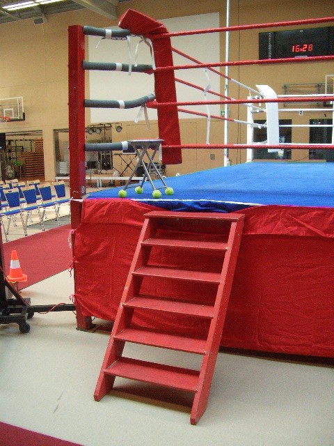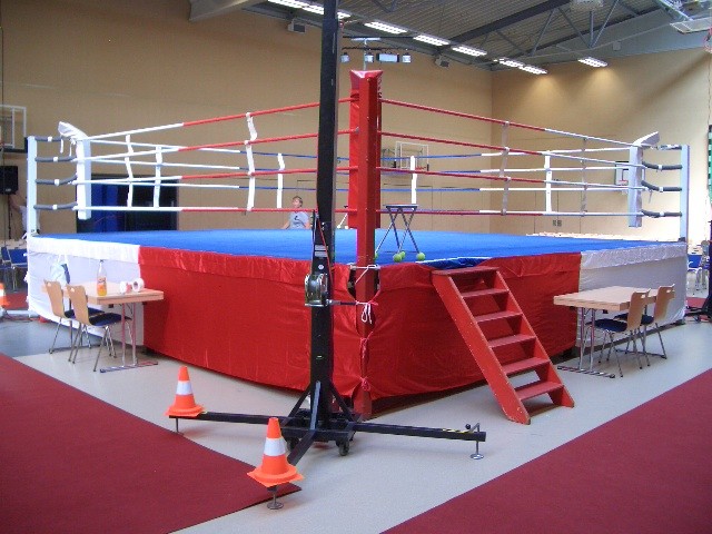 Er hat Olympiamaße und eine quadratische Grundfläche mit 6,50 m Seitenlänge. Die Höhe beträgt 110 cm. Im Lieferumfang sind 4-Ringseile, Eckpolster, Treppen, Hocker etc. enthalten. Auch der Aufbau und der Abbau des Ringes sind in unserem Service inbegriffen. Wir benötigen dafür etwa drei Stunden. Auf- und Abbauhelfer müssen durch Sie gestellt werden.