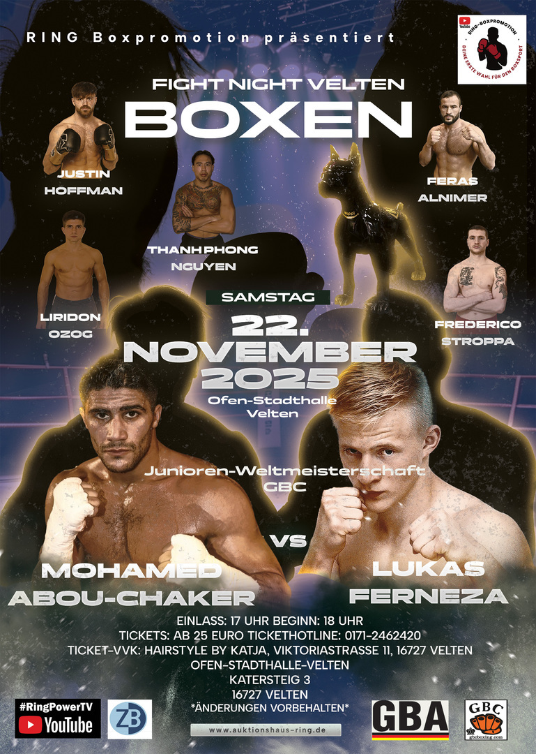 Am Samstag, den 22.11.2025, werden wir für Sie in der Ofen-Stadt-Halle Velten insgesamt 13 Profiboxkämpfen veranstalten. Hauptkampf des Abends ist der erste Titelkampf von unserem Frontfighter Momo Abou-Chaker gegen den starken Slowaken Lukas Ferneza über 10 Runden um die vacante GBC Junioren Weltmeisterschaft im Mittelgewicht. Nicht minder spannend dürfte auch das Berliner Cruisergewichtsduell zwischen dem bislang noch ungeschlagenen Boxtempel Berlin Fighter Justin Hoffmann (7 -0, 7KO) und seinem schlagstarken Herausforderer Feras Alnimmer werden. Weitere interessante Fightcardteilnehmer sind auch Berlin/Vietnam Sensation Phong Nguyen sowie die Berliner Rookies Zaurbek Santymbaev, Tamas Kovac, Federico Stroppa und Maurice Milcke