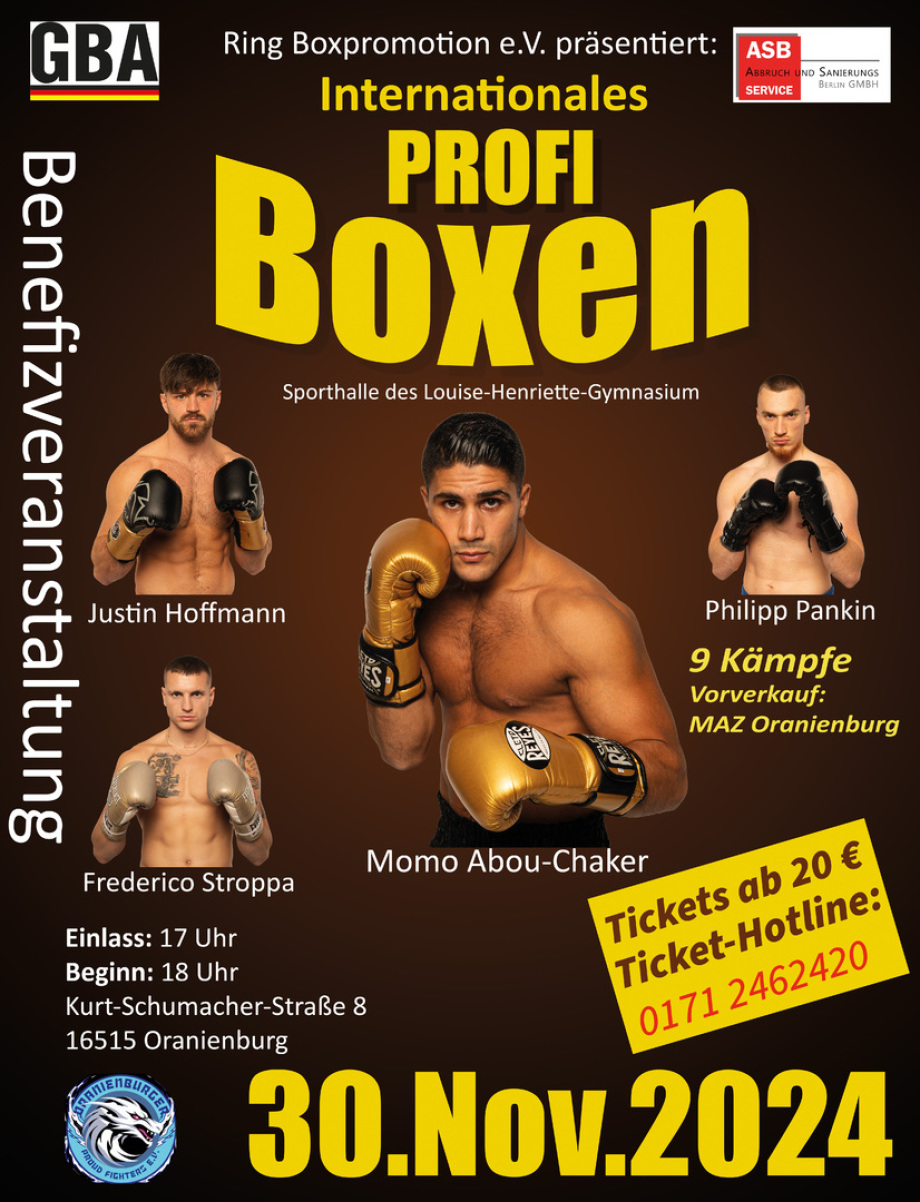Am Samstag, den 30.11.2024 veranstaltet die Ring Box Promotion in Oranienburg ein Benefiz-Profiboxevent.